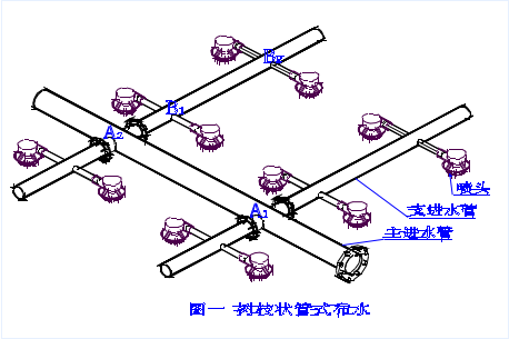 逆流冷卻塔循環(huán)水系統(tǒng)的布水方式采用管式布水,呈樹枝狀,循環(huán)水先進(jìn)入主管,然后進(jìn)入支管,再進(jìn)入噴頭,主管、支管、噴頭相互垂直,如圖一。根據(jù)流體狀態(tài)方程:壓力(P)×流速(V)=常數(shù)(K),循環(huán)水從主管流經(jīng)A1點(diǎn)、A2點(diǎn)后,到達(dá)主管末端,由于冷卻塔布水需要主管末端是封閉的,因此流速(V)急劇下降,壓力(P)急劇上升,所以A2處比A1處水壓頭大,同理B2處比B1處水壓頭大,綜上分析各布水噴頭處的水壓頭不相