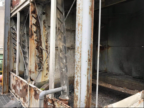 根據(jù)上圖的結(jié)構(gòu)我們還知道,閉式冷卻塔盤管的四周是被鍍鋁鋅板外殼所包圍著的,所以我們在拆了收水器后,還需要將外殼也拆除了。
