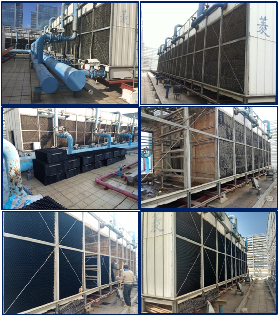 TCL總部大樓采購國內(nèi)知名品牌,冷卻塔總冷量為6000冷噸,原生產(chǎn)廠家已經(jīng)停止生產(chǎn)該款尺寸冷卻塔填料,管道多個(gè)部位均出現(xiàn)破裂漏水,我司排除專業(yè)技術(shù)團(tuán)隊(duì),在不停機(jī)狀況下完成整個(gè)升級(jí)改造,效果于新設(shè)備無異。